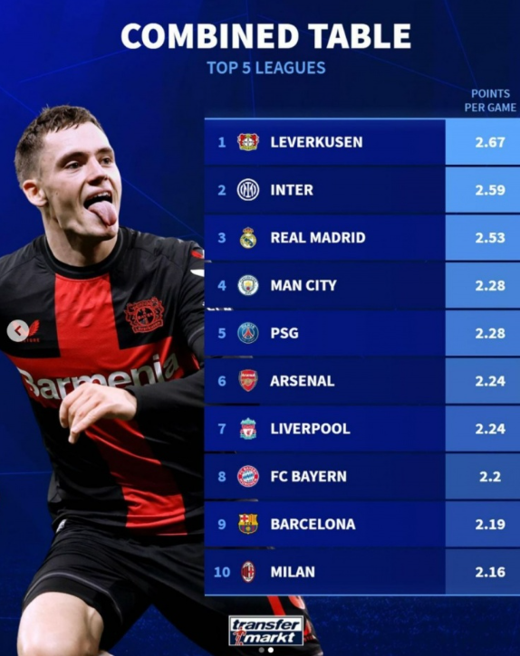 4月23日,在本賽季的五大聯賽中,德轉盤點了球隊在聯賽中場均積分榜上的表現,勒沃庫森以2.67分的成績穩居榜首,成為唯一一支目前仍然保持不敗的球隊。這份榜單反映了各支球隊在聯賽中的穩定表現,以及其在競技場上的優異表現。