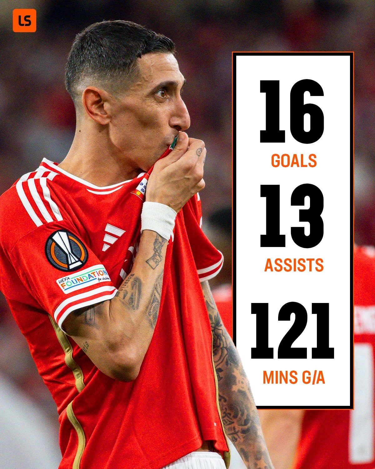 36歲的迪馬利亞本賽季為本菲卡打了43場比賽,攻入16球,助攻13次,幫助本菲卡進入歐羅巴聯賽8強,葡萄牙超級聯賽排名第二,落后葡萄牙體育4分。
